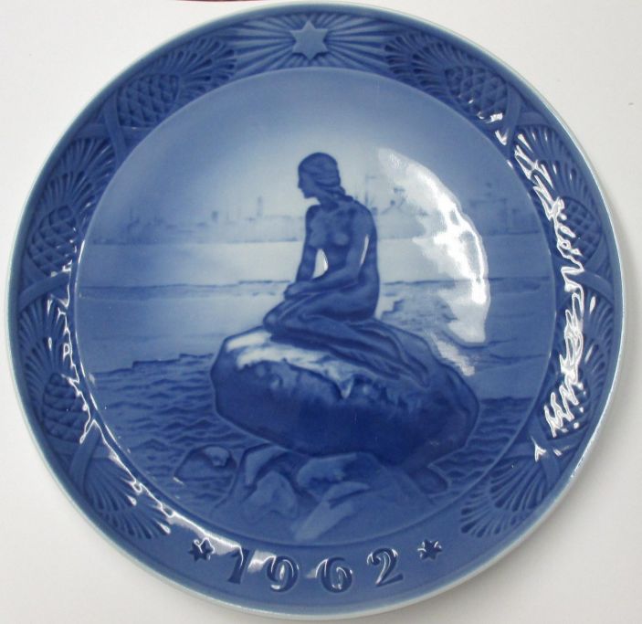 Royal Copenhagen Weihnachtsteller, 1962, Kopenhagen, Dänemark. Blau bemalt. Dekoriert mit The Little Mermaid im Winter, Kopenhagen. Dia:. 18,5 cm.