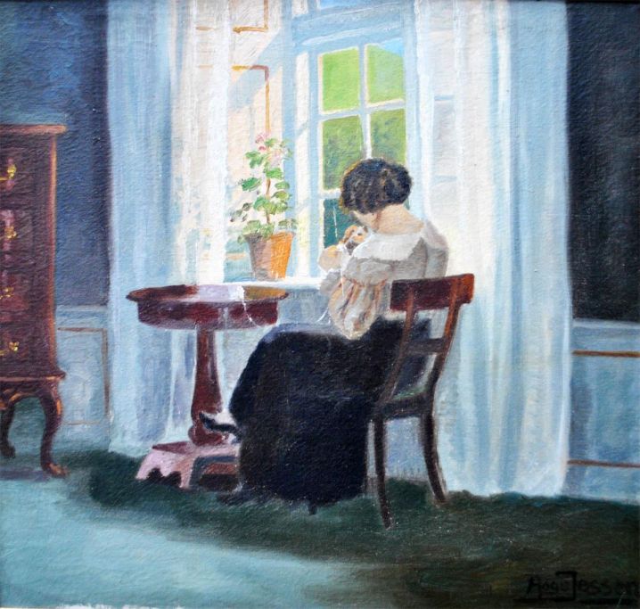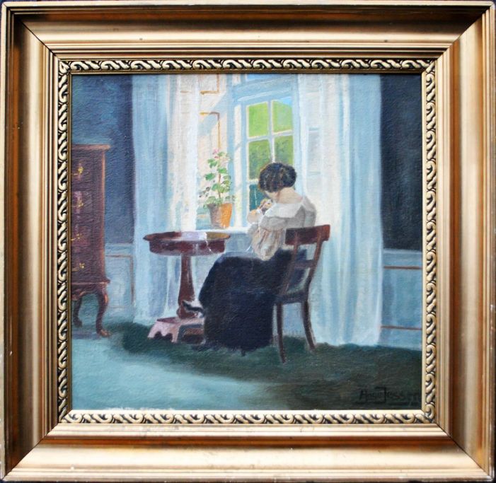 Jessen, Aage (1876 - 1961) Dänemark: Interieur mit junger Frau am Fenster. Signiert Aage Jessen. Öl auf Leinwand. 48 x 49,5 cm.