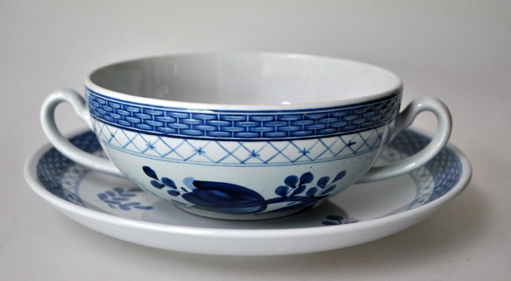 Royal Copenhagen, 1653, Bouillon Tasse mit Untertasse, Trankebar, 20. Jahrhundert Kopenhagen, Dänemark. Gestempelt. Untertasse Dia: 19 cm. Tassen dia: 13 cm. Tasse mit zwei Griffen.