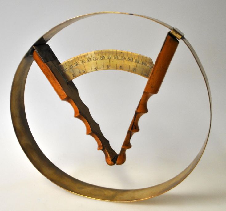 Antiker Hutmesser, Dänemark des 19. Jahrhunderts. Messingring, Holzgriff und Messgerät. Kann von Größe 49 - 63 messen. Extrahierter Durchmesser: 19 cm.
