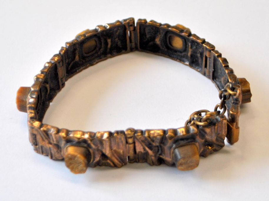 Bronze Schmuckset, bestehend aus Armband, Halskette und Ring, Pentti Sarpaneva, Finnland des 20. Jahrhunderts. Bronze mit Tigerauge. Armbandlänge: 18 cm. Ring kann vergrößert / verkleinert werden. Anhängerlänge .: 6,5 cm. Kettenlänge .: 54 cm.