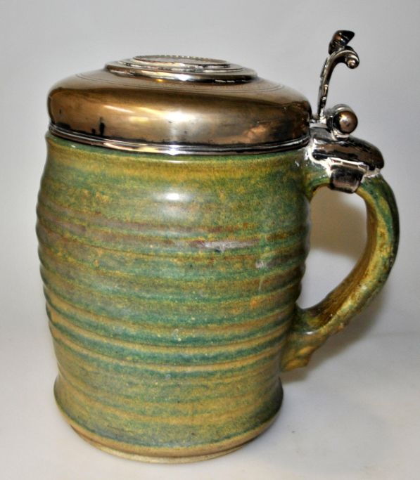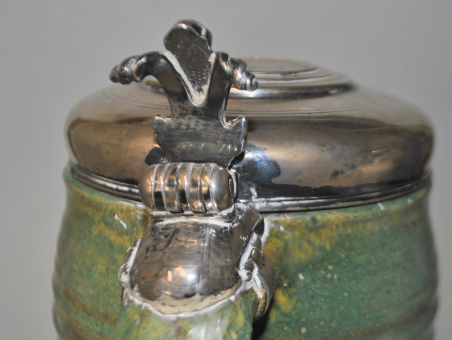 Barocker Deckelkrug mit Silberdeckel, 1799, Randers, Dänemark. Krug aus grüner Keramik, signiert DK. Entworfen in Randers ca. 1930. Deckel und griff in Silber, hergestellt von Silberschmied: Niels Peder Høvring (ca. 1761 - 1818) Randers. Deckel mit Silbermünze, 3 Mark Dänisch von 1723. Gestempelt. Deckel mit Gravur: N. Bruun & A. M Lindegaard 1799. Griff mit Figur. Geek mit Gewichtsangabe.