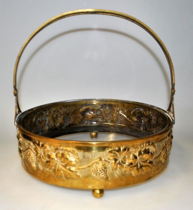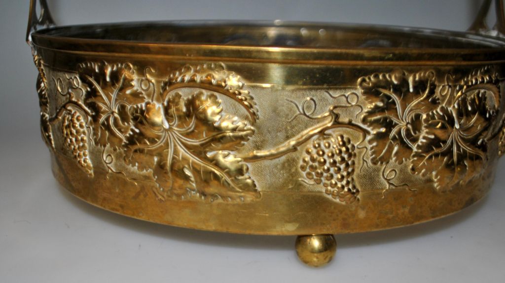 Obstschale aus Messing mit Glaseinsatz, WMF, ca. 1900, Deutschland. Mit Griff. Die Seiten mit Weinlaub verziert. Auf vier Kugelbeinen. Glaseinsatz aus Klarglas mit abgerundetem Boden. H.: 7,5cm. Durchm.: 23,5 cm. Höhe mit Griff: 24 cm.