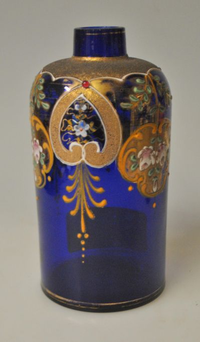 Parfümflasche aus blauem Glas mit Emaildekor und Vergoldung, 19. Jh. H: 13,5 cm.