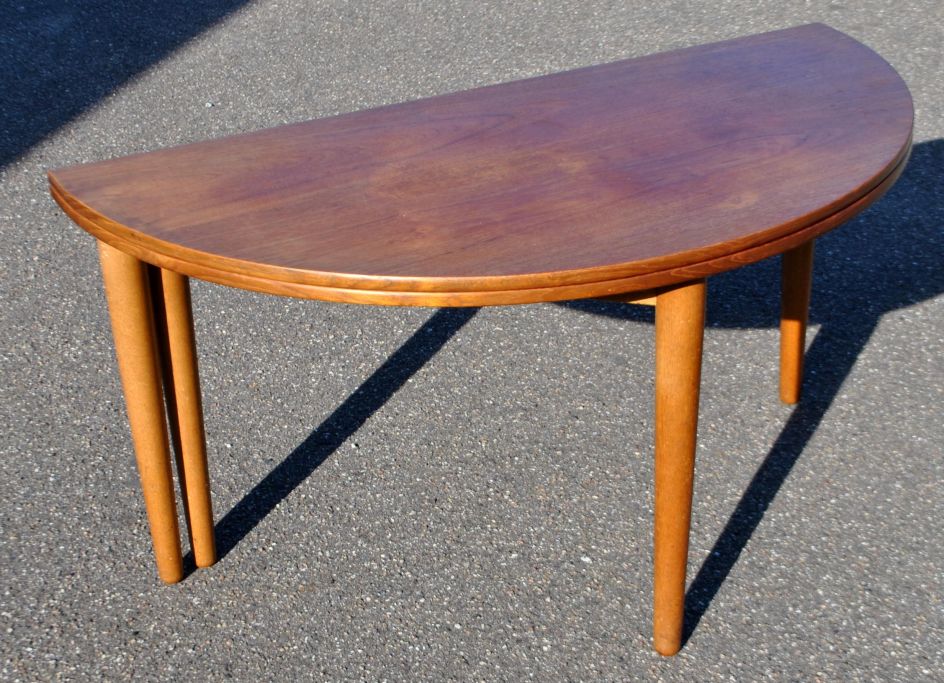 Teak / Eiche Couchtisch, ca. 1960. Hergestellt von Erling Christensen, Aarhus. Dänemark. Mit 4 Beinen, von denen eines ausklappbar ist. Runder Platte, der halbmondförmig gefaltet werden kann. H.: 62 cm. Durchm. Platte 119 cm.