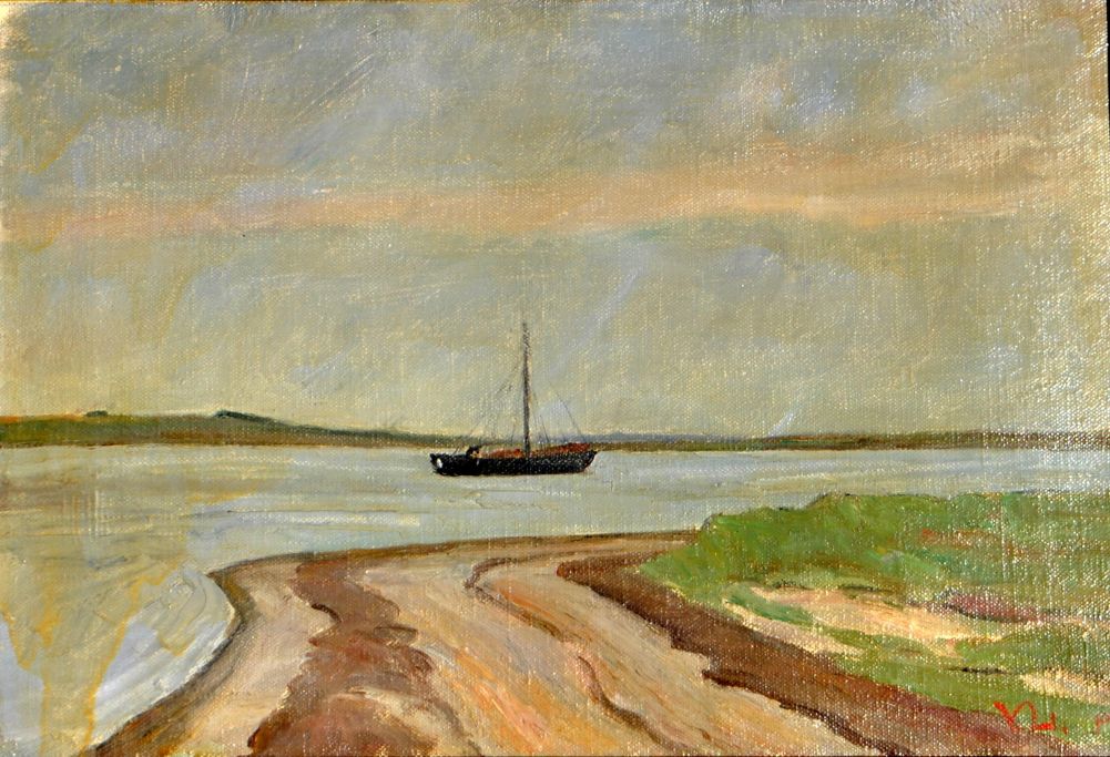 Dänischer Künstler (20. Jahrhundert): Ein Boot auf dem Wasser. Öl auf Leinwand. Signiert: VL 1919. 25 x 38 cm.