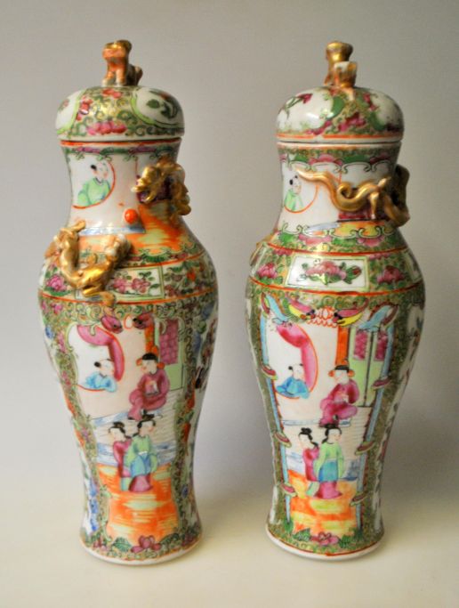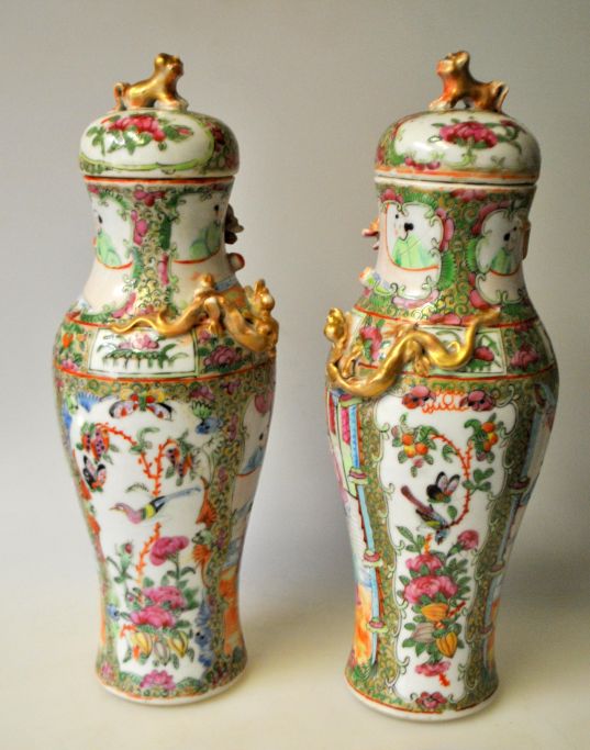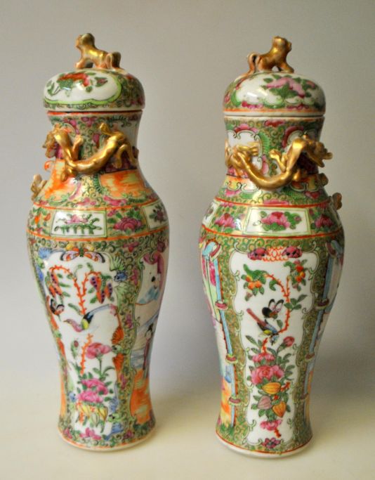 Paar chinesische Deckelvasen, Canton famille rose, ca. 1850. Zwei handgemalte Szenen mit Menschen auf Terrassen. Auch polychrome Dekorationen von Blumen, Vögeln und Schmetterlingen. Vergoldete Drachen mit einer Kugel dazwischen. Deckel verziert mit vergoldetem Löwen. Höhe: 29 cm.