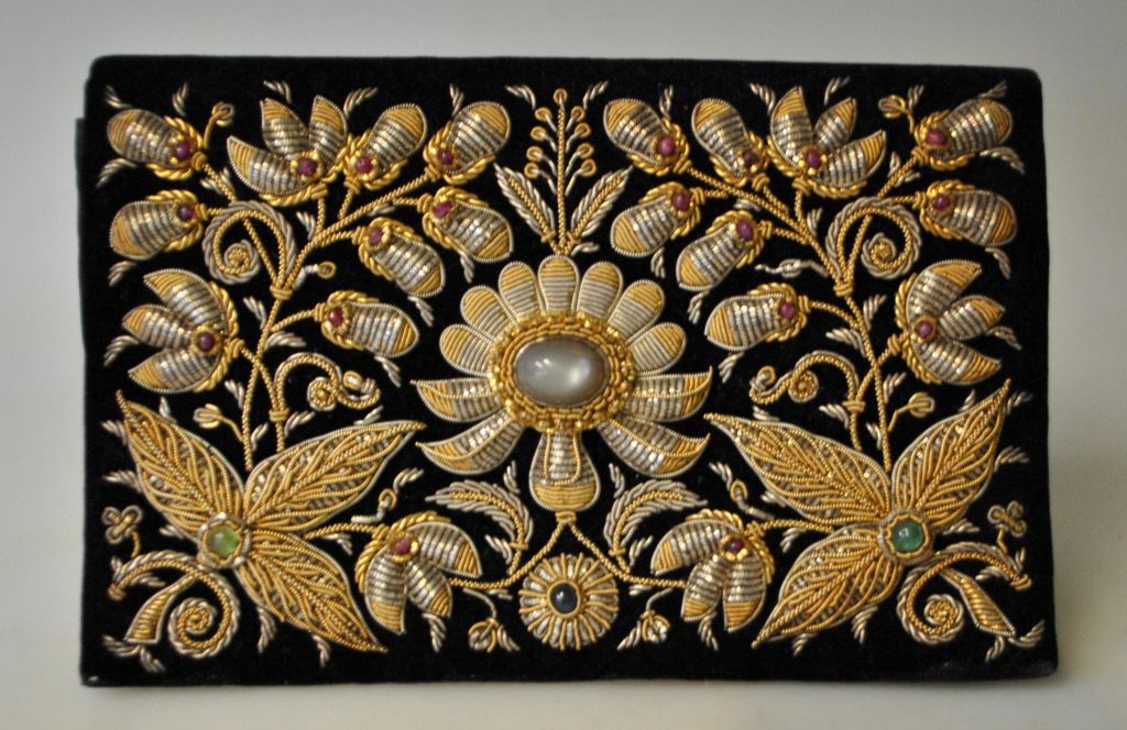 Zardozi Gold bestickte Samt-Firmentasche, Ganeshi Lall & Son, Agra, Indien, 20. Jahrhundert. Tasche mit Silber- und Goldfadenstickerei und zahlreichen Edelsteinen, u.a. 18 Rubine, Turmaline etc. 13 x 20 cm. Innen mit Firmenetikett.