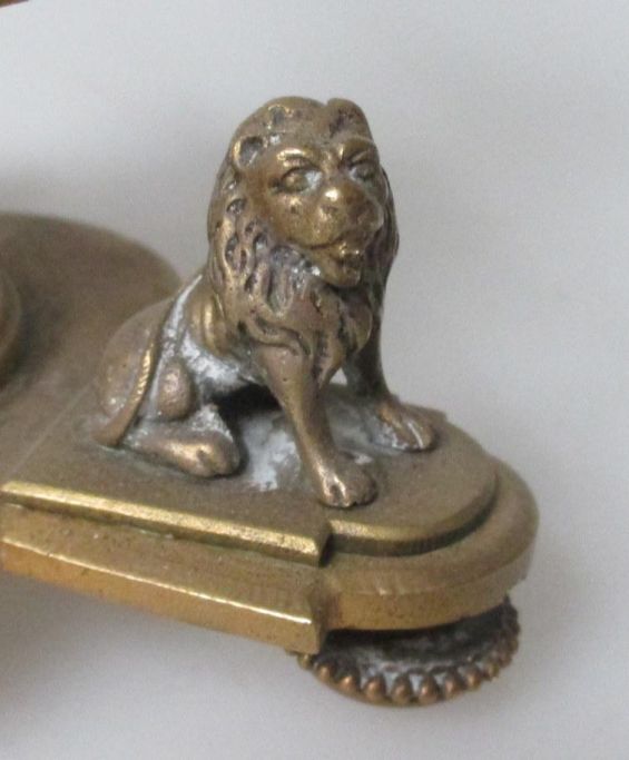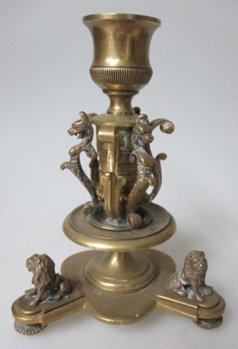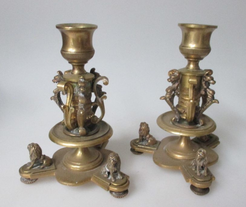 Paar Bronze Leuchter, 19. Jh. Frankreich. Mit Dekorationen auf Basis mit Sitzende Löwen; Stämme mit Drallen und Jermen. Tülle mit Drallen. H:. 14 cm.