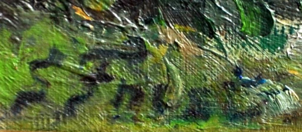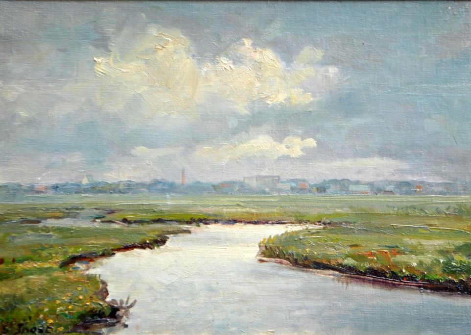 Frost, Sergius (1900 – 1994) Dänemark: Tarm Å in Richtung Skjern gesehen, 1970. Öl auf Leinwand. Signiert S. Frost. 26,5 x 36,5 cm.