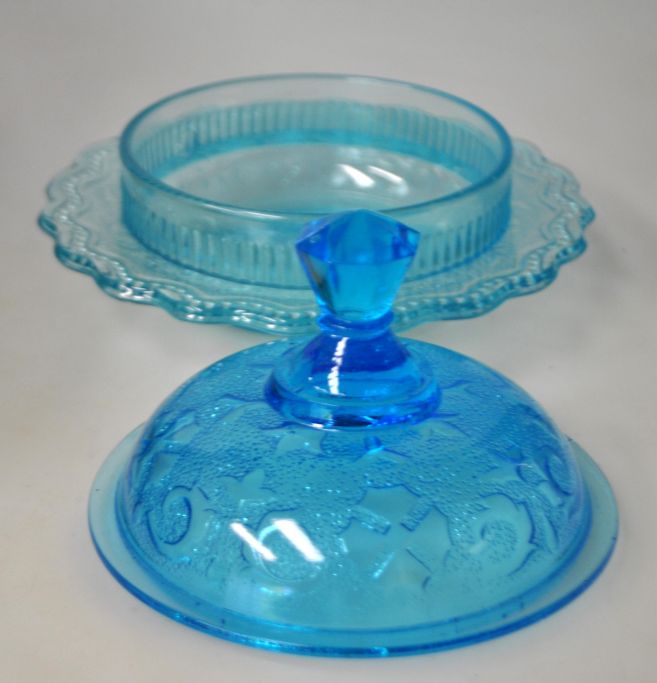Butterbehälter, ca. Um 1900. Blaues Pressglas. Mit Mustern verziert. Welliger Rand. Mit sechseckigem Deckelknauf. H.: 10,5 cm. Durchmesser: 16 cm.