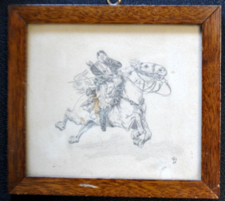 Unbekannter Künstler (19. Jahrhundert): Ein Soldat zu Pferd. Signiert: Monogramm. 11 x 12,5 cm.