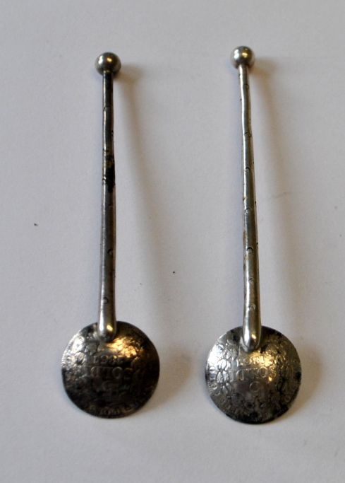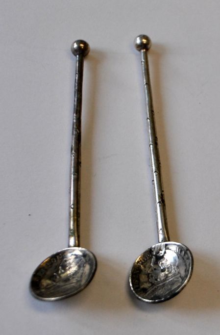 Ein Paar antike Salzlöffel aus Silber. Italien des 19. Jahrhunderts. Laf in Form von Silbermünzen aus Rom mit Papst Pius IX., 5 Soldi von 1867. L.: 7 cm.