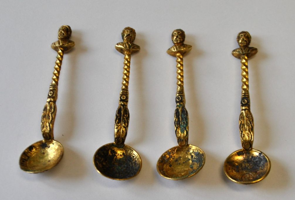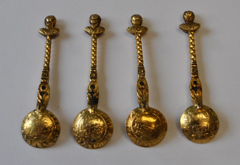 Ein Satz von 4 vergoldeten Salzlöffeln, Dänemark aus dem 17. Jahrhundert. Laf in Form von Skillingmünzen aus den Jahren 1642, 1652, 1617 und 1625. Alle aus der Zeit Christians IV. L.: 6,5 cm. Ungestempelt.