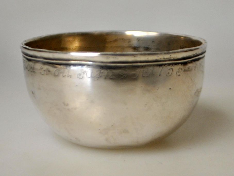 Silberbecher, Hochzeitsbecher 1753, Dänemark. Am Rand der Text: „W. .... Folch das ist mein Name. Trink auf mich. das ist dein Gafn, anno 1753“. Höhe: 3 cm. Durchmesser: 5,4 cm. Auf der Unterseite sind die Buchstaben eingraviert: PW – der Name des Meisters.