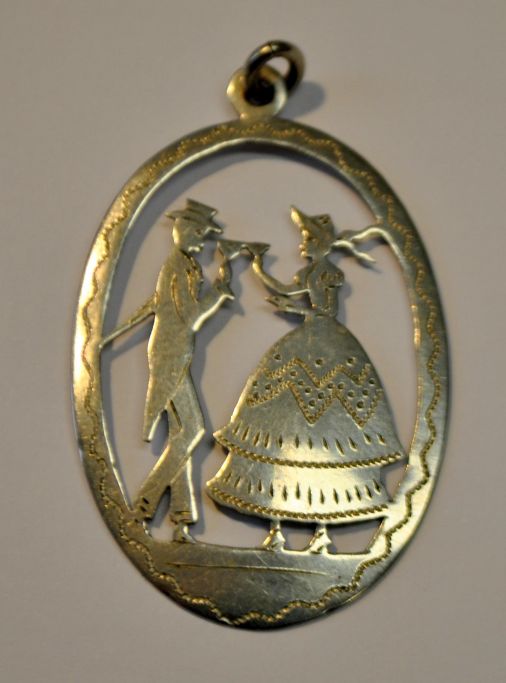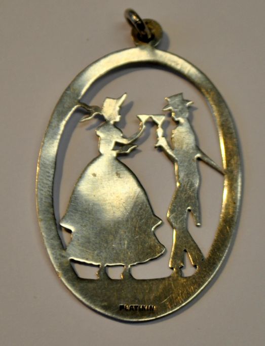 Anhänger aus Platin, 20. Jahrhundert. Oval. Mit Mann und Frau beim Toasten. Gestempelt. Höhe: 4 cm.