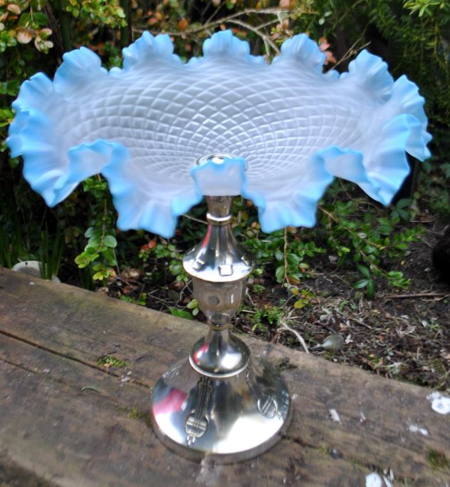 Großer schwedischer Jugendstil-Tischaufsatz aus Glas, 1916. Fuß aus versilbertem Messing mit Verzierungen. Profilierter Stiel. Glas in Milchglas mit Waffelmuster. Blauer gerüschter Rand. Höhe: 33,5 cm.