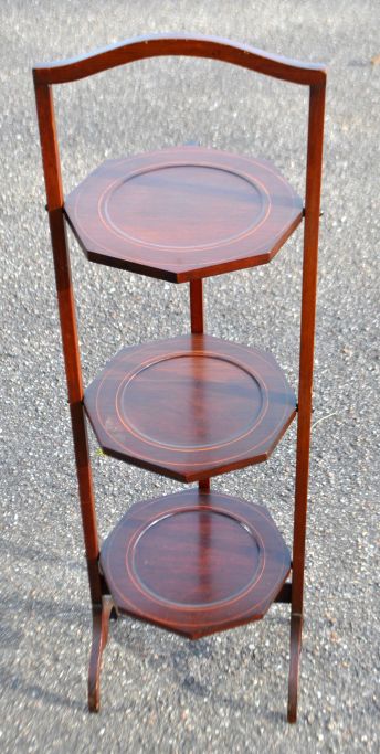 Englischer Tortenständer aus Mahagoni, 19. Jahrhundert. Mit drei Ablageflächen und Einlage. Faltbar. Höhe: 90 cm. B: 27,5 cm.