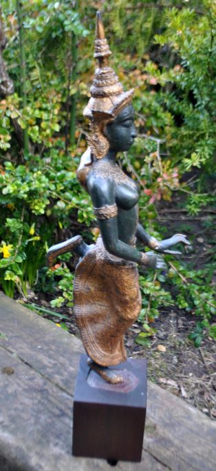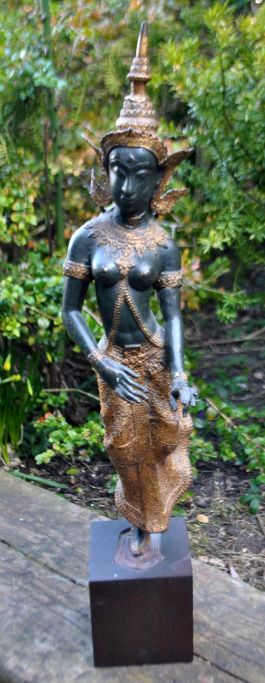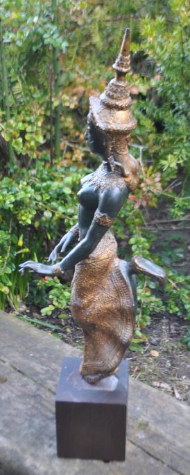 Tanzende Frau, Thailand, 20. Jahrhundert. Verlorenes Feuer. Mit Vergoldung. Auf einem Holzsockel. Höhe: 60,5 cm.