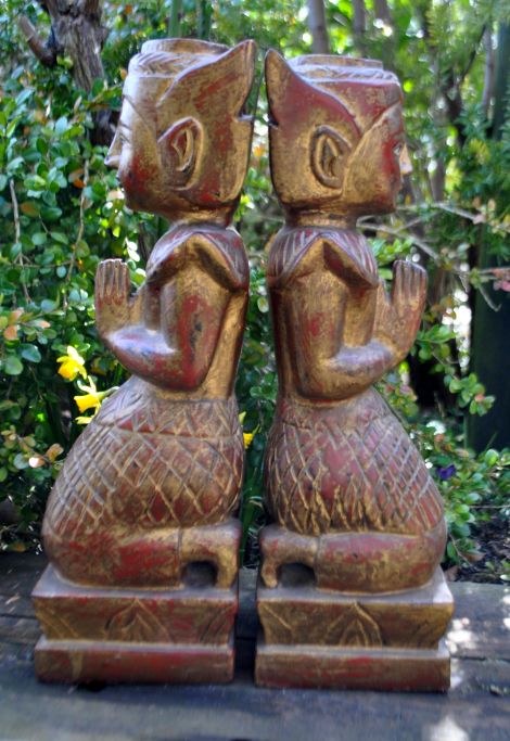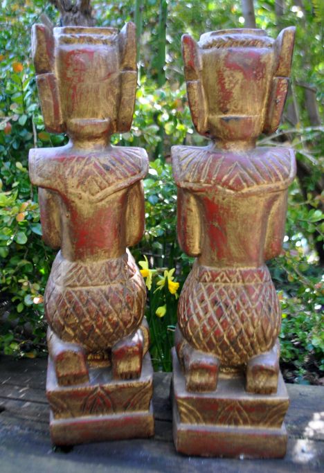 Paar hölzerne Tempelwächter, Thailand, 20. Jahrhundert. Vergoldet und bemalt. Höhe: 38 cm. B: 11 cm. D: 12 cm.