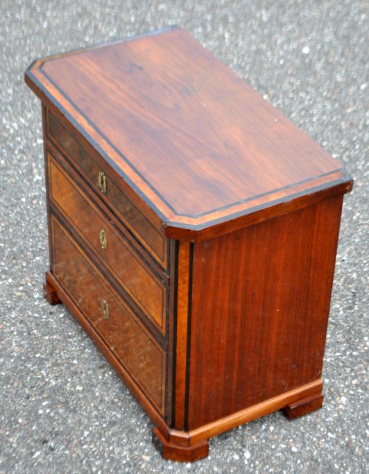 Dänische Kinderkommode, poliertes Walnussholz/Walnussrot, 19. Jahrhundert. Mit drei Schubladen. Höhe: 36 cm. B: 40 cm. D: 22,5 cm.