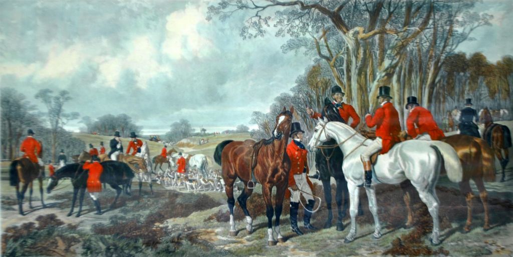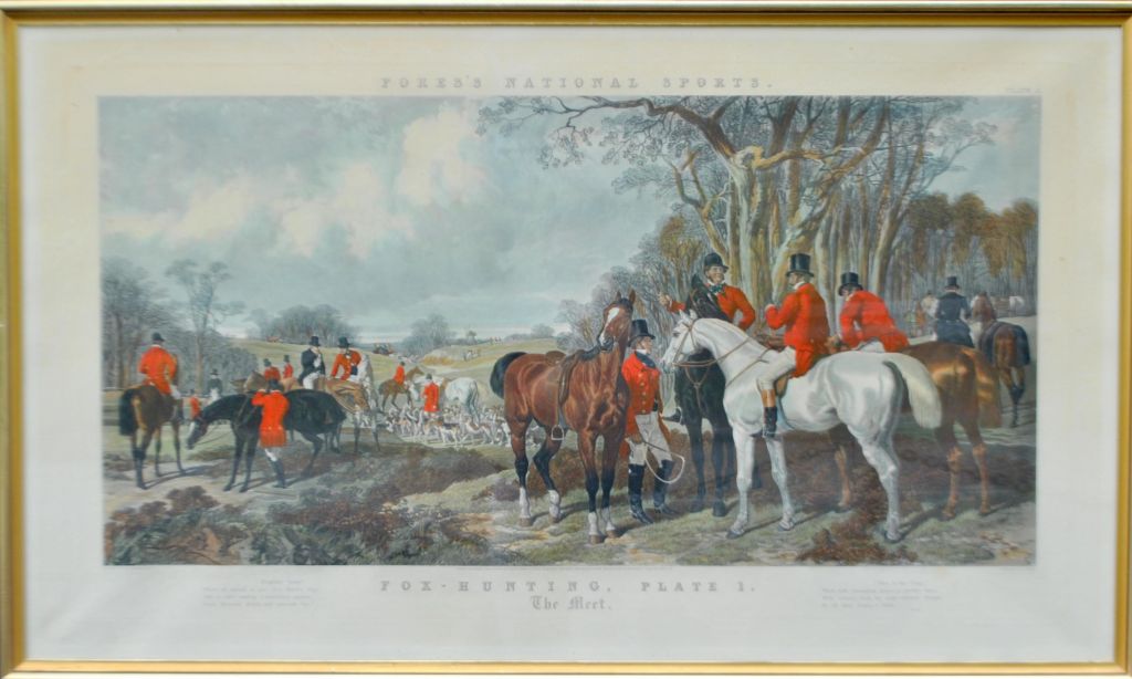 Englischer Künstler (19. Jahrhundert): Fuchsjagd, Tafel 1 „The Meet“, 1852, London, England. Handkolorierte Lithographie. Nach John Frederick Herring dem Älteren (1795–1865). Stich von J. Harris (1808–1846). Gedruckt von Fores für die National Sports-Serie. Mit Unterschriften und Gedicht. H: 62 cm. B: 107 cm.