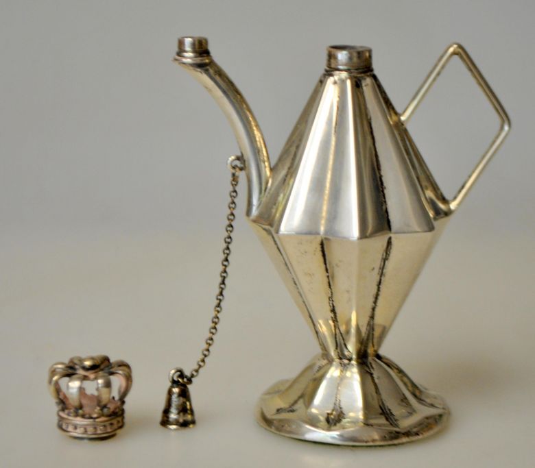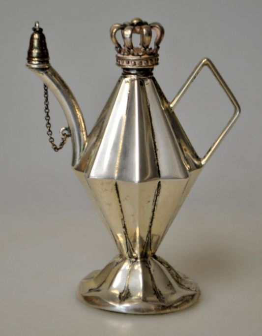 Hugo Grün, kleine Öllampe aus Silber, 20. Jahrhundert. Kopenhagen, Dänemark. Gestempelt: 835S H.Gr. Mit Deckel in Form einer Königskrone. Mit Henkel und Ausguss. Auf einem gefüllten Fuß. H. 9 cm.