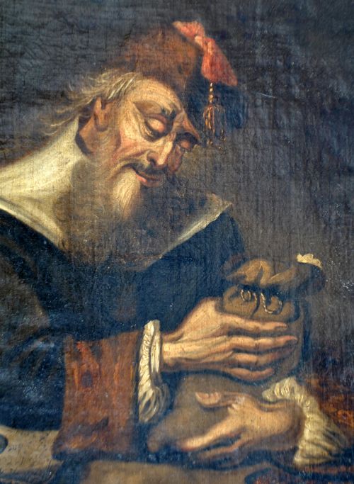 Myn, Georg van der (1727/28 - 1763) Niederlande - nach: Der Wucherer. "Der Wucherer". Schwach signiert: 1766. Öl auf Leinwand. 53 x 43.
