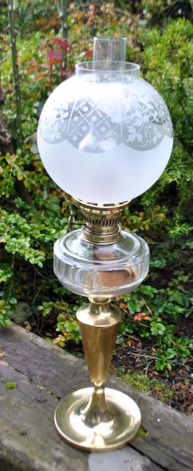 Petroleumlampe, um 1880. Sockel aus Messing, Behälter aus klarem Glas mit Einschnitten und oberer Kuppel aus Milchglas mit Verzierungen. Höhe mit Brenner: 63 cm.