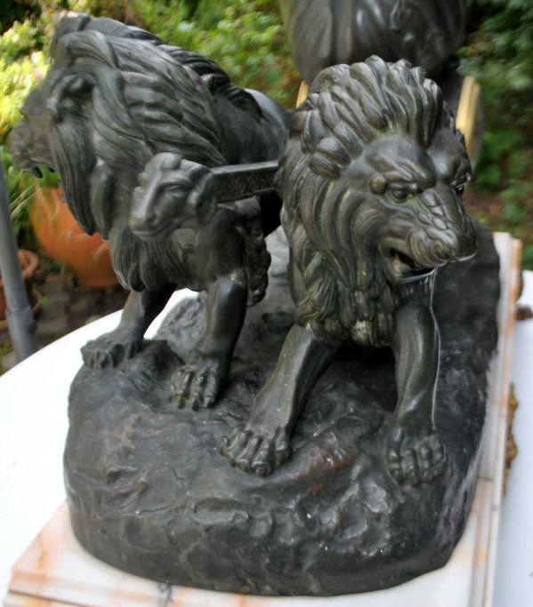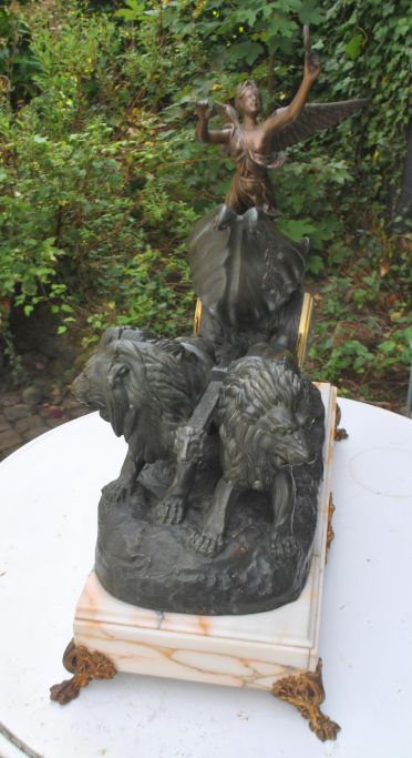 Riesige französische Kaminuhr, 19. Jahrhundert. Char de la Concorde. Nike – die personifizierte Siegesgöttin. Zinkuhr auf Marmorsockel. Nike auf einem von Löwen gezogenen Streitwagen. Die Figuren sind bronziert.