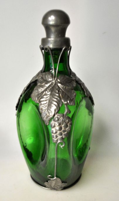 Dreieckige grüne Art-Deco-Flasche mit Zinnmontierung, 1930er Jahre, Dänemark. H: 25 cm.