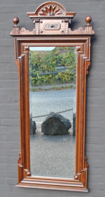 Großer dänischer Flurspiegel, 1870-1880. Nussbaum und Mahagoni. Platte mit Verzierungen und Kugeln. Abgeschrägter Spiegel. H.: 159 cm. B: 67 cm.