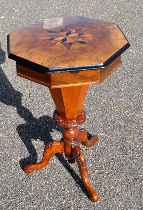8-seitiger Nähtisch aus Walnussholz mit Intarsien, 19. Jahrhundert. Dänemark. Auf geschnitztem Dreibein. 8-seitige Säule zur Garnaufbewahrung. 8-seitige Platte mit Tischplatte. Innen mit 8 Fächern. Mit Schlüssel und Schloss. Platte mit Intarsien in Sternmuster verziert. Poliert. H.: 72 cm. Durchmesser Platte: 42 cm.