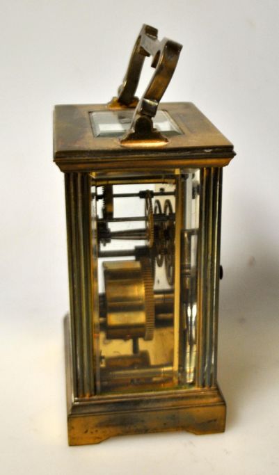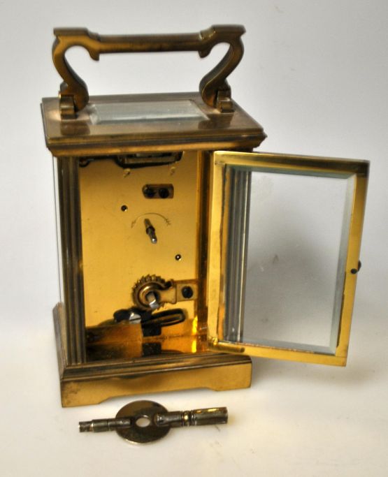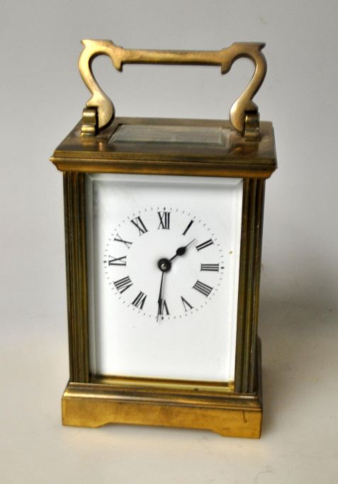 Französische Reiseuhr aus Messing, 19. Jahrhundert. Mit Glas. Emailzifferblatt mit römischen Ziffern, schwarze Zeiger. Glas facettiert, Einblick aus vier Winkeln. H.: 11,5 cm. Mit Griff: 16 cm. Schlüssel inklusive.