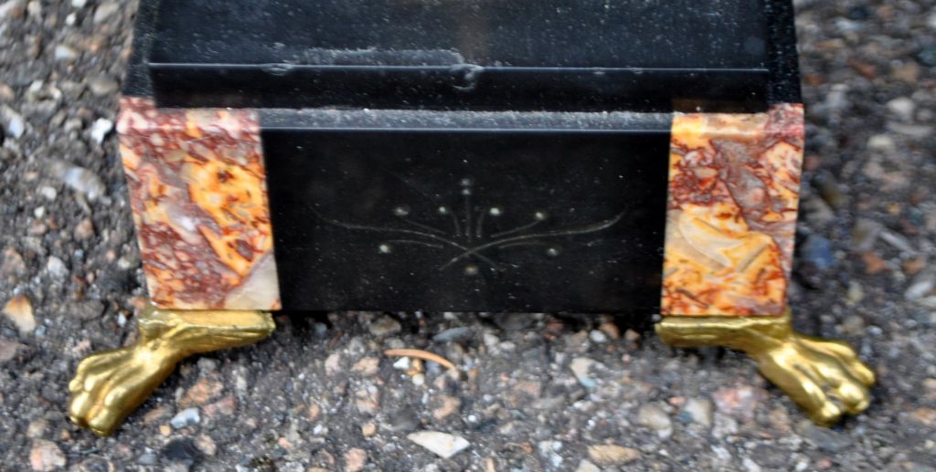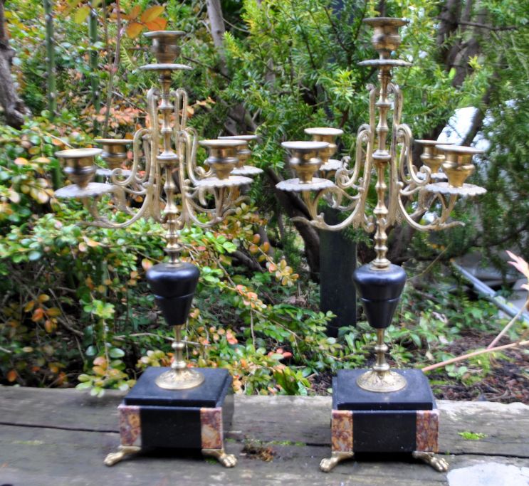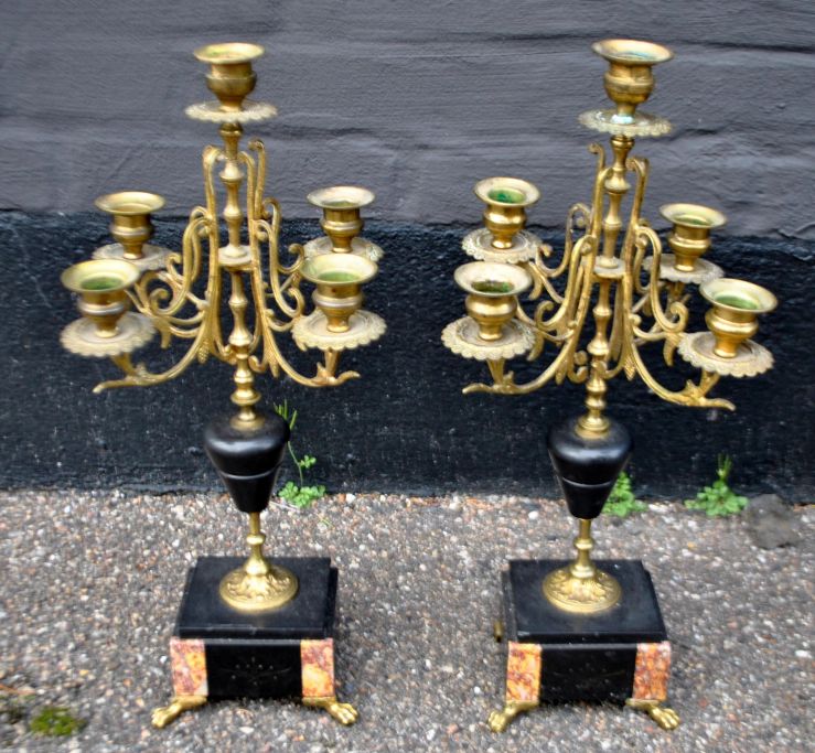 Ein Paar französischer fünfarmiger Kandelaber, 19. Jahrhundert. Messing und schwarzer Marmor/melierter Marmor. H.: 41 cm.