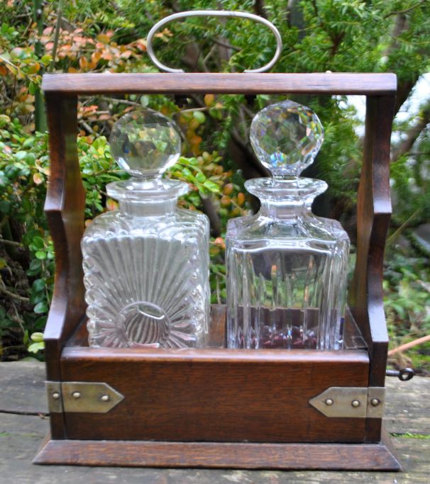 Tantalus aus Eichenholz mit zwei verschiedenen Kristallkaraffen mit Stöpseln. England. 19. Jahrhundert. Griff und Beschläge aus Messing. Seitliche Öffnung mit Schloss und Schlüssel. L: 26 cm. H: 32 cm.