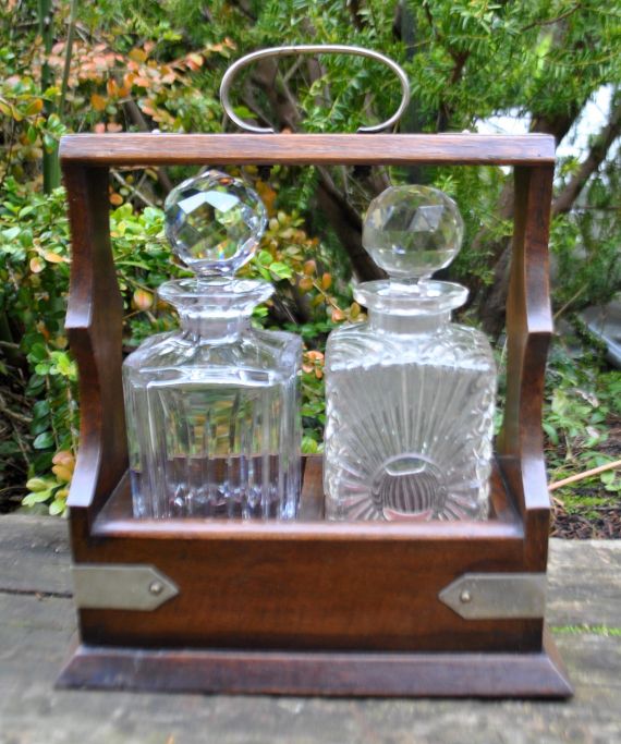 Tantalus aus Eiche mit zwei verschiedenen Kristallkaraffen mit Stöpseln. England. 19. Jahrhundert