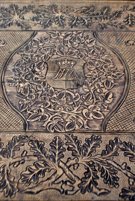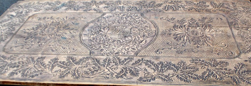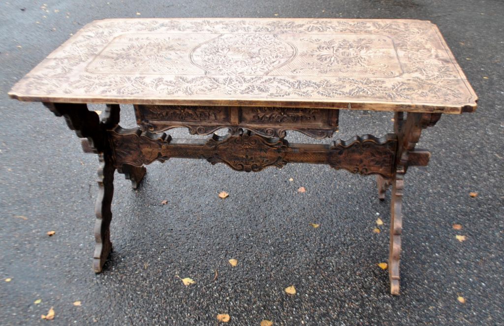 Antiker langer Tisch mit Schnitzereien und Schublade, 19. Jahrhundert. Unzählige Schnitzereien auf Platte, Schublade, Beinen und Sockel. In der Mitte eine Schnitzerei einer Herzogskrone. Wahrscheinlich Deutschland. L.: 141 cm. B.: 73 cm. T.: 77 cm.