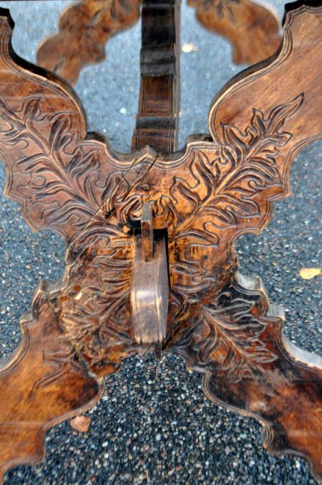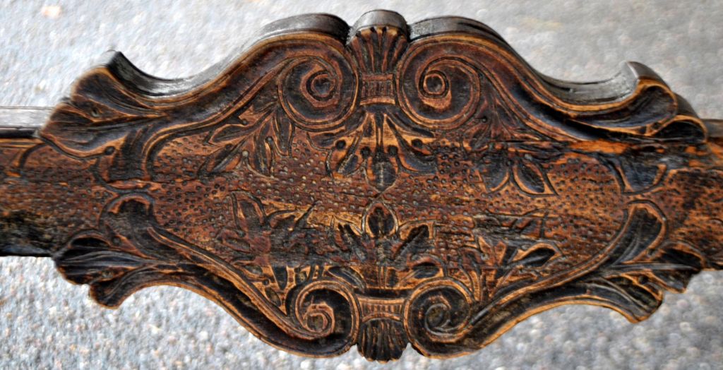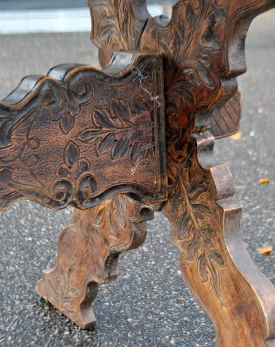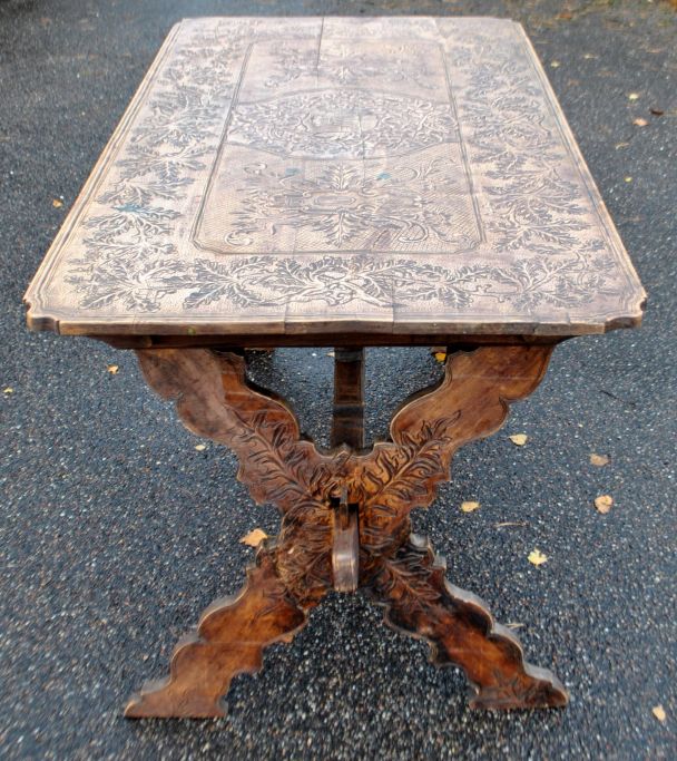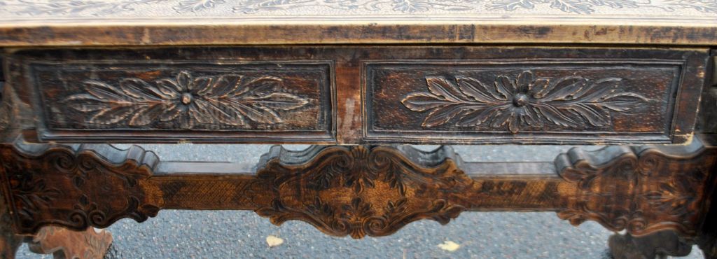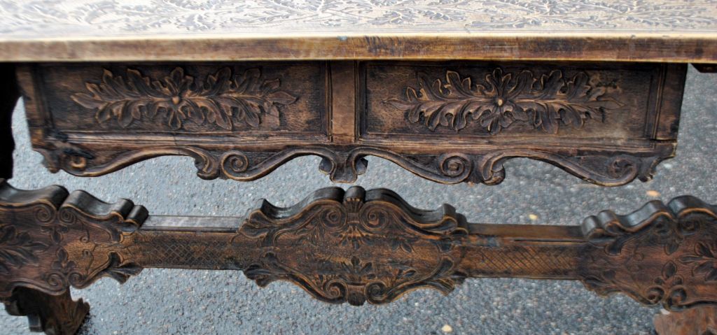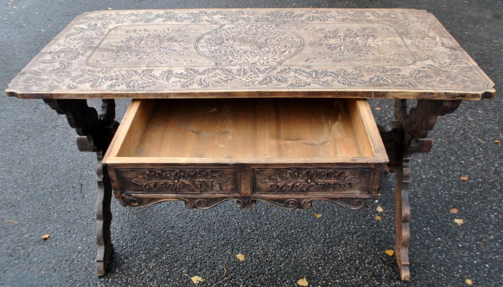 Antiker langer Tisch mit Schnitzereien und Schublade, 19. Jahrhundert.