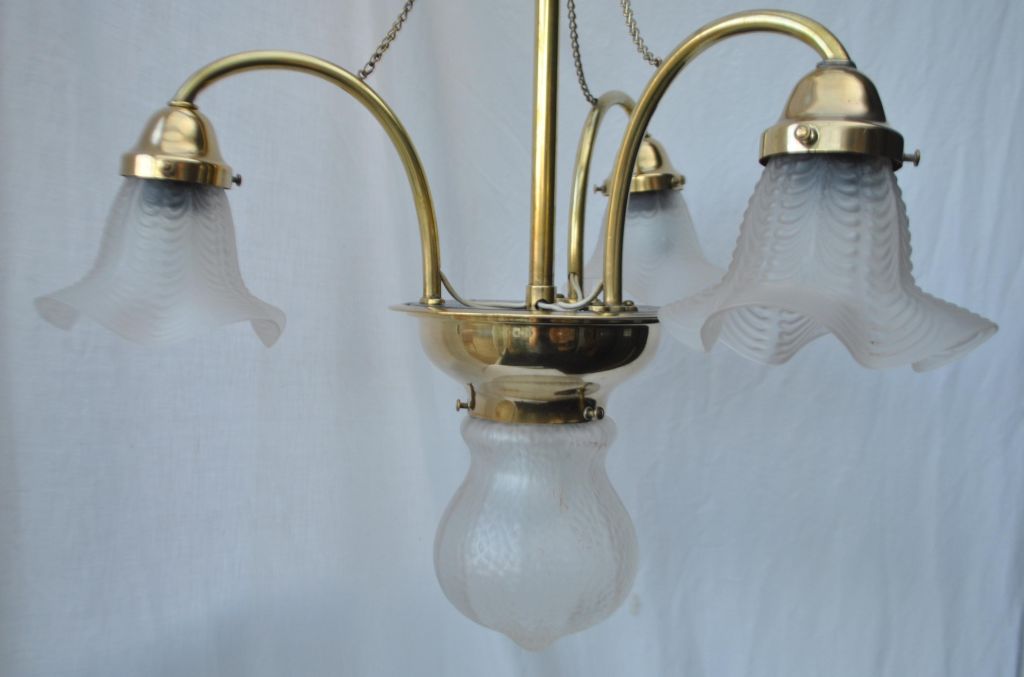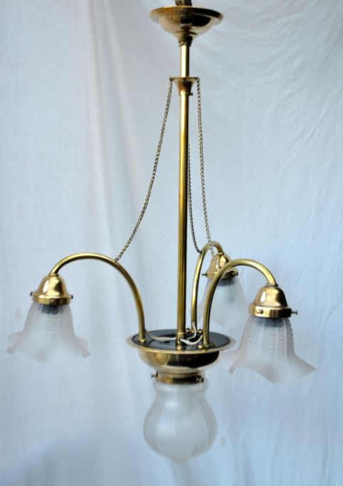 Dänische Jugendstil-Lampe aus Messing mit vier Kuppeln, ca. 1910. Die mittlere Kuppel ist zwiebelförmig und aus mattiertem Glas. Jeder Lampenarm verfügt über drei geriffelte, mattierte Lampengläser. Mit drei Aufhängeketten. Höhe: 80 cm. Durchmesser: 50 cm.