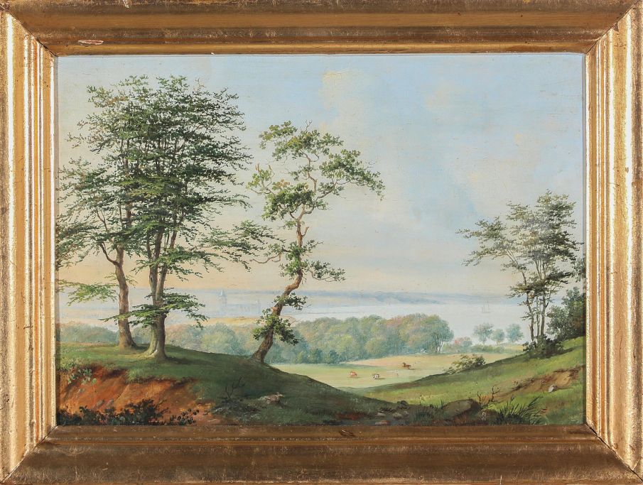 Holm, Peter (1798–1875) Dänemark: Sommerlandschaft mit Blick auf die Bucht von Aarhus und die Stadt. Blick von Frederikshøk, Højbjerg. Öl auf Metallplatten. Signiert: PH 1846. 18 × 25 cm.