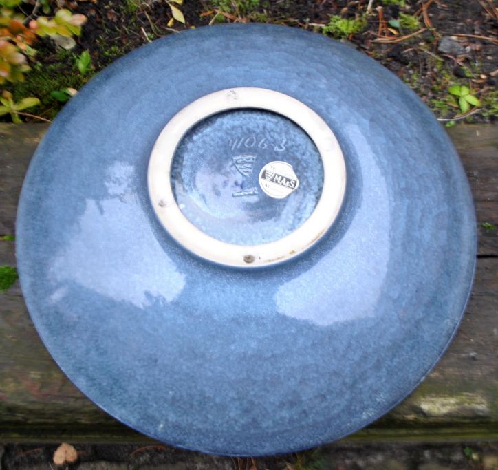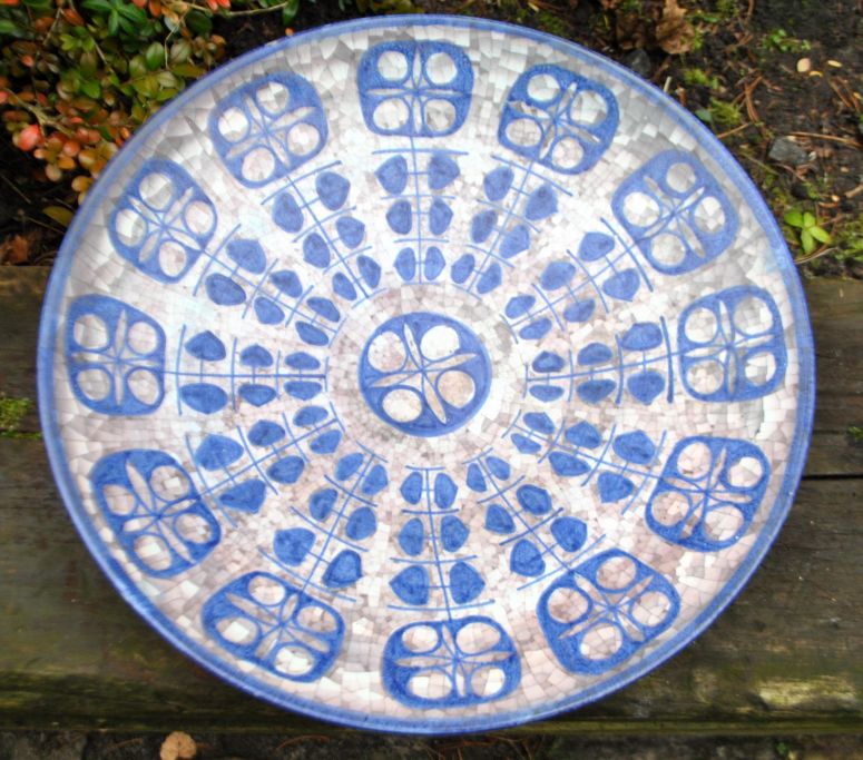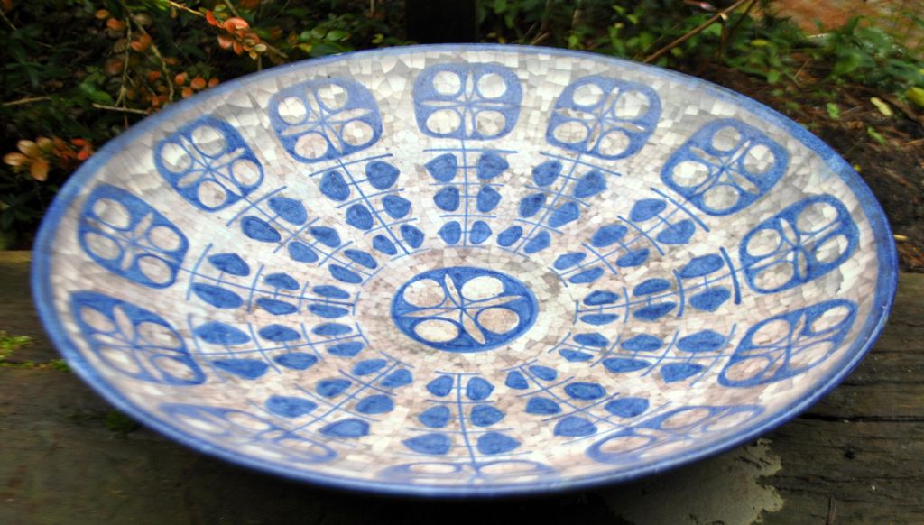 Keramikschale Nr. 4106-3 von Michael Andersen & Søn, Bornholm, Dänemark, nach 1930. Dekoriert in Blau- und Grautönen auf Mosaikgrund. Signiert MS und mit drei Fischen gestempelt. Durchmesser: 40 cm.