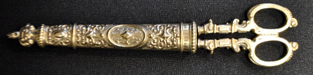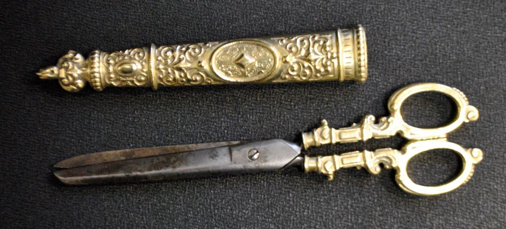 Messingschere in verzierter Messingscheide, 1880. L. 26,5 cm.