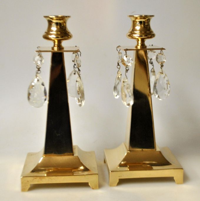 Paar dänische Art-Deco-Kerzenleuchter aus Messing mit Prismen, um 1920. Höhe: 21 cm.