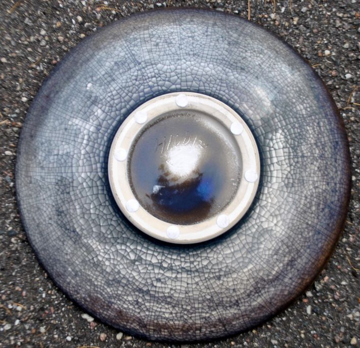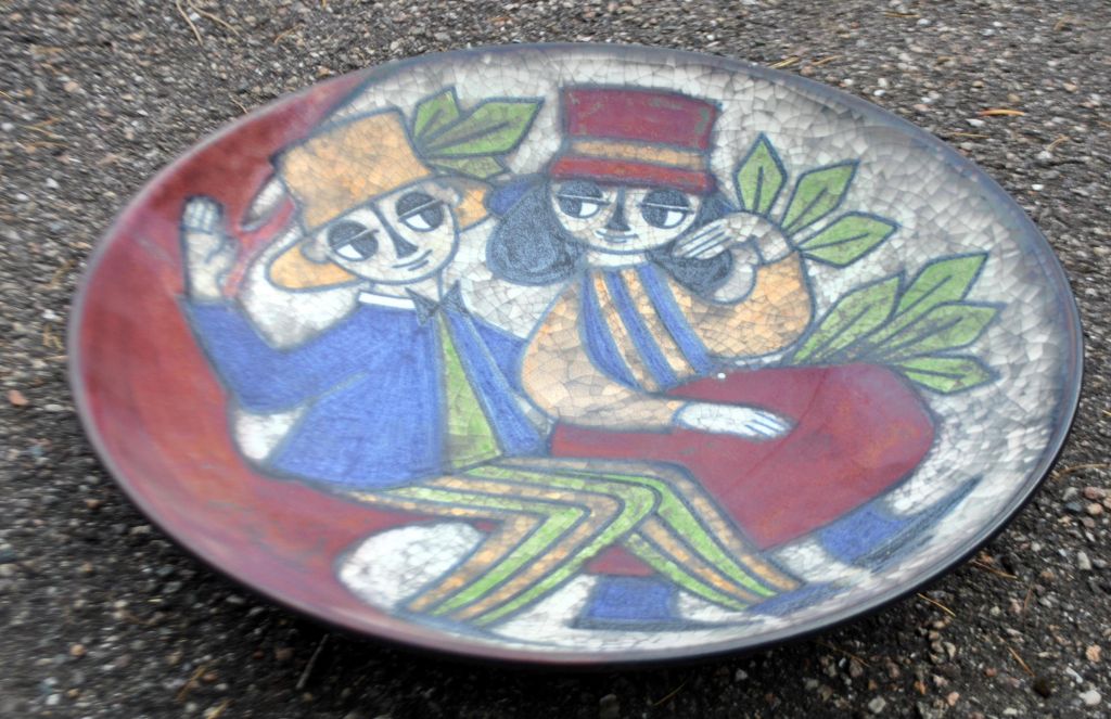 Keramikschale Nr. 4106-2 von Michael Andersen & Søn, 20. Jahrhundert. Bornholm, Dänemark. Schale aus glasierter Keramik, verziert mit Figuren und Craquelé-Glasur. Gestempelt mit den drei Heringen aus dem Stadtwappen von Rønne. Höhe: 8 cm. Durchmesser: 35,5 cm.
