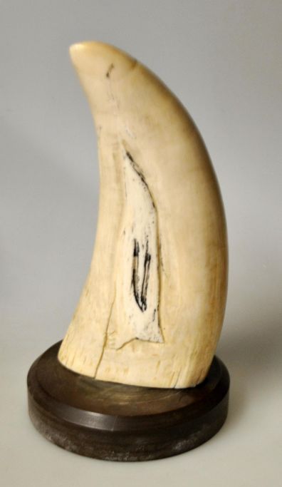Grönländischer Pottwalzahn auf Bakelitsockel. 19.–20. Jahrhundert. Eine Seite mit einem geschnitzten Vogel verziert. Höhe: 13,8 cm. Höhe mit Sockel: 16 cm.