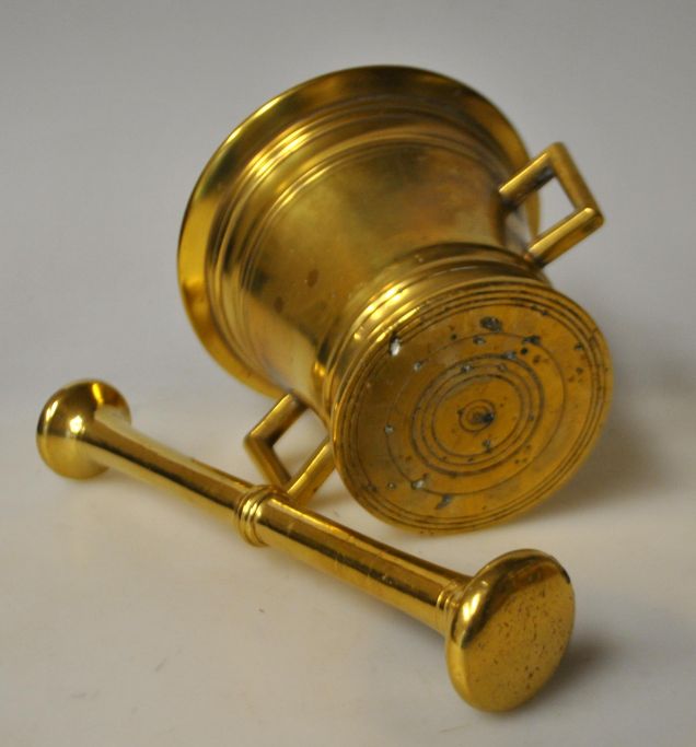 Dänischer Messingmörser mit Stößel, 19. Jahrhundert.