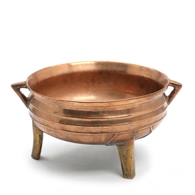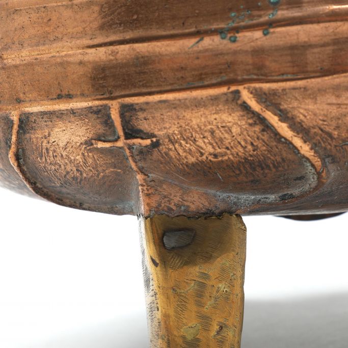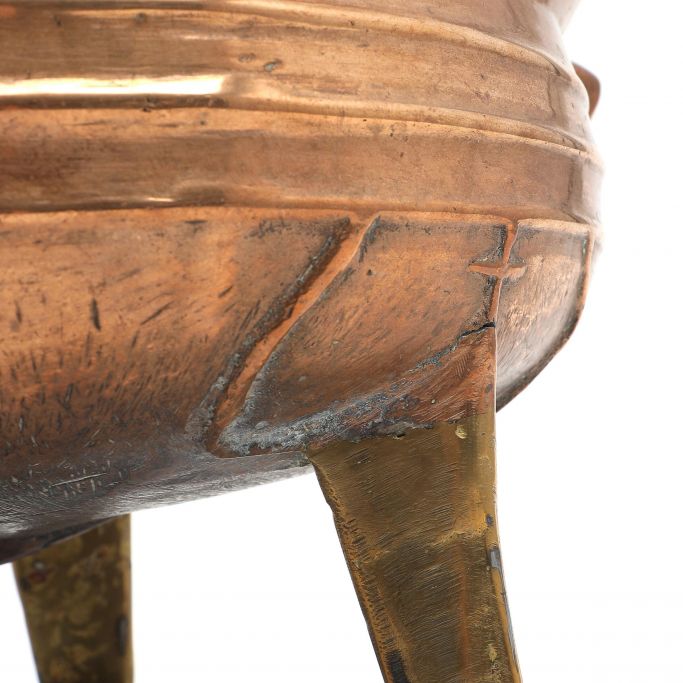 Dreibeiniger Erztopf aus der Renaissance, 15./16. Jahrhundert. Mit seitlichen Verzierungen, darunter Rippen. Repariert. Drei Beine aus Messing wurden später hinzugefügt. Der Topf wurde kürzlich poliert. Höhe: 18,5 cm. Durchmesser: 31,5 cm.
