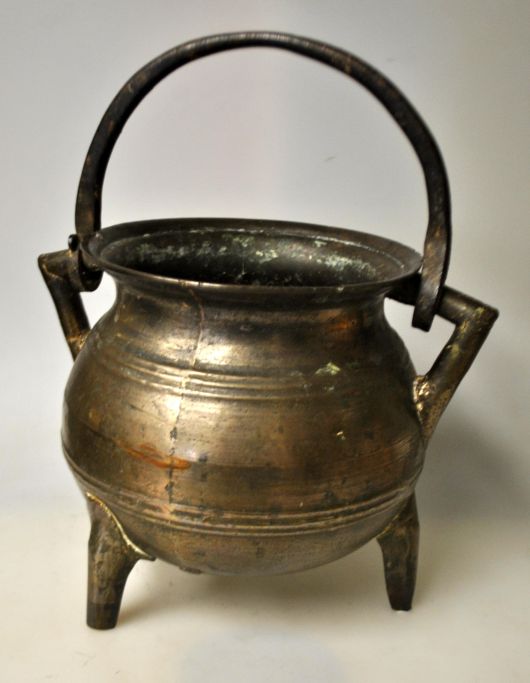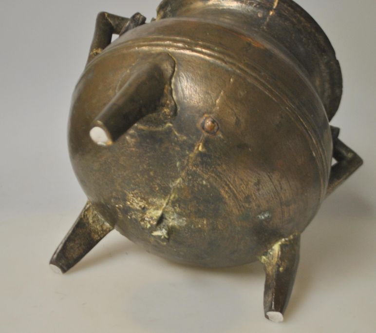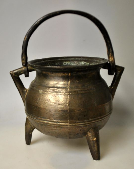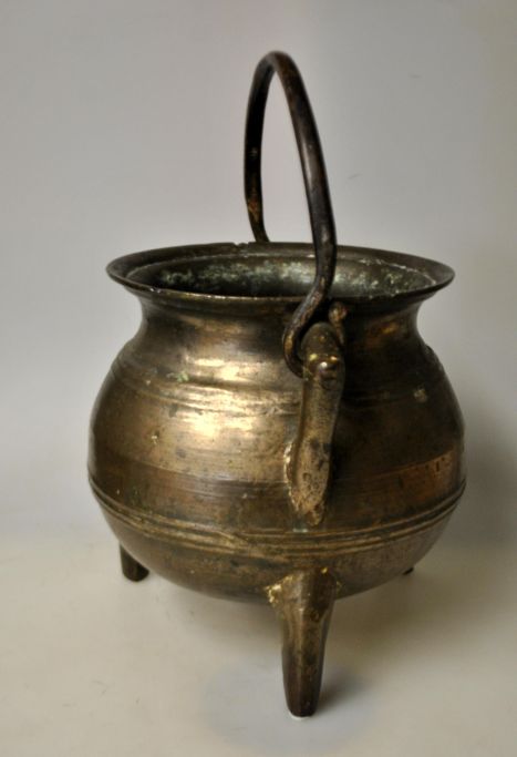 Mittelalterlicher dreibeiniger Topf, Erzgefäß, Norddeutschland. Mit drei Beinen, Henkel und Griff. Aus gegossenem Erz. Mit Linienverzierungen. Höhe: 18,5 cm. Durchmesser der Öffnung: 16 cm.