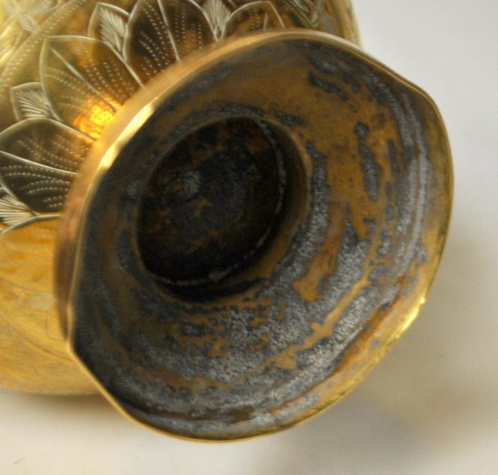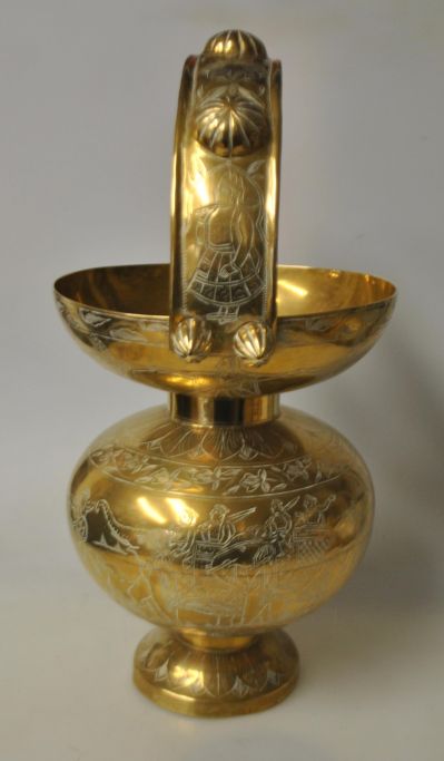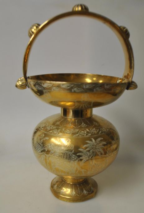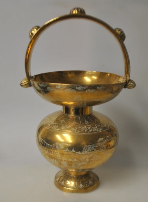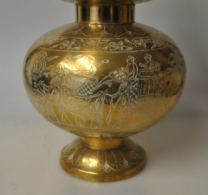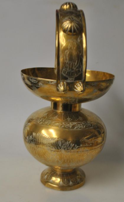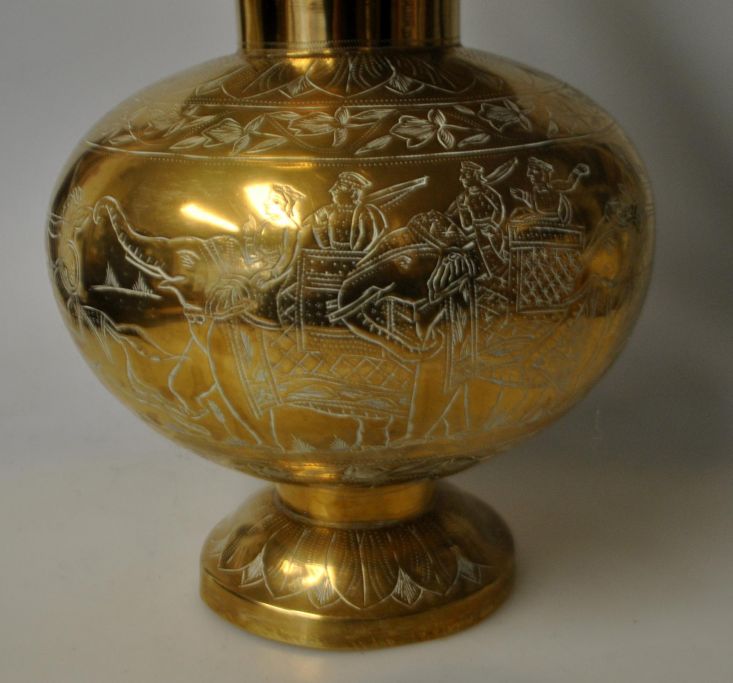 Große indische Messingvase mit Henkel, ca. 1950. Mit gravierten Darstellungen einer Elefantenjagd auf einen Tiger. An der Seite sind vier Tiger abgebildet. Außerdem sind florale Motive eingraviert. 32 cm hoch, 21 cm breit.